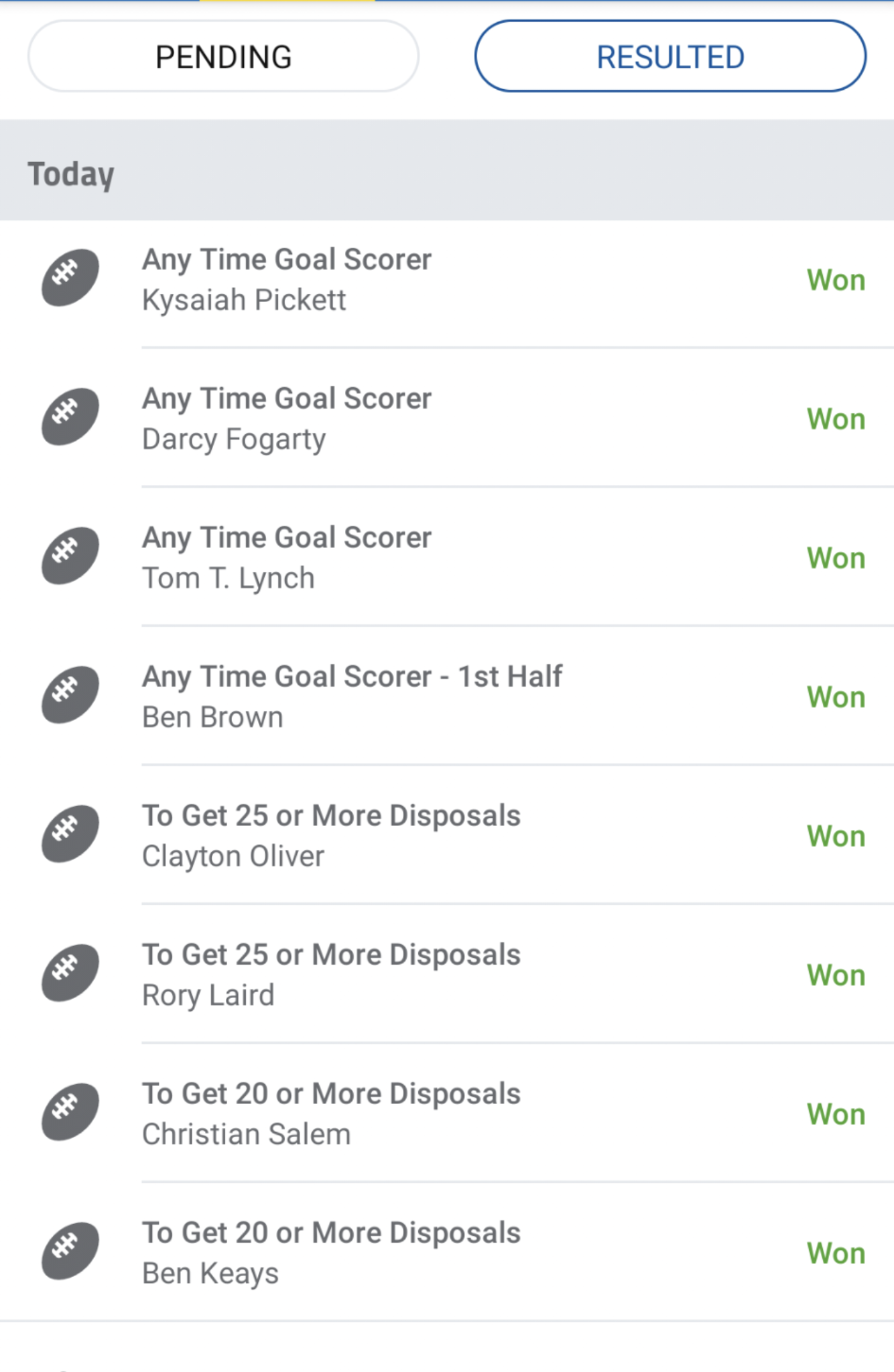 I had a 14 leg multi tonight for 5 bucks to win 1060 and needed brayshaw to get 6 possessions last qtr after having 9 first 3 and dixon to kick one more goal in last. Brayshaw got 7 possessions in last and Charlie kicked one on siren. Thank you very much. It won't let me post my bet on but I sent to lightning mcqueen for him to post as he has more idea than I do. Got day off at pub tomorrow too. U beauty.