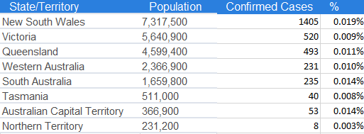 locky801 wrote:Confirmed cases as of 0700 hrs this morning 186 new cases in the last 24 hrs So far appears only 181,000 tests have been conducted Australia wide