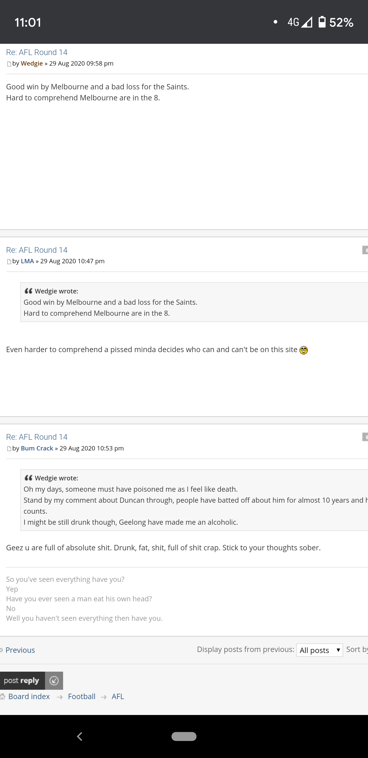 If I'm out and about on my phone and see something that deserves a ban I'll just hit the ban button and fix up the period when I get home as I did in this case, LMA got the same ban for the same reason too. Both were in August so should be back soon enough if they're apologetic and improve their behaviour. Here's a screenshot of the offending posts: