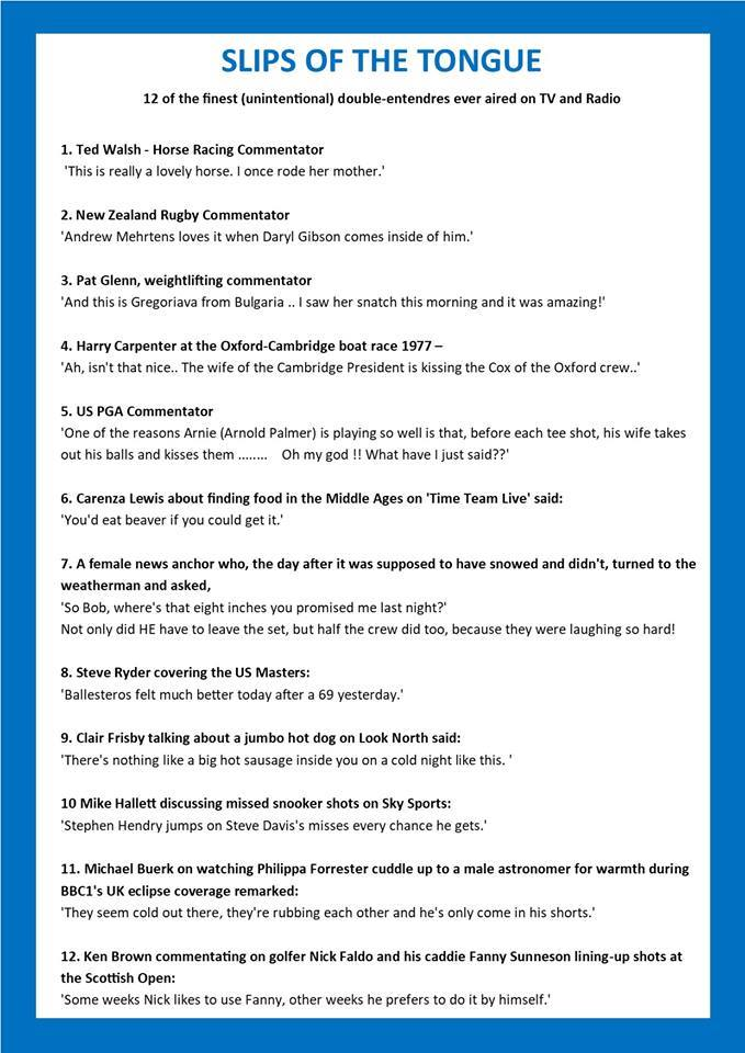 Admittedly, its not a double entendre but a classic sporting commentary gaff.