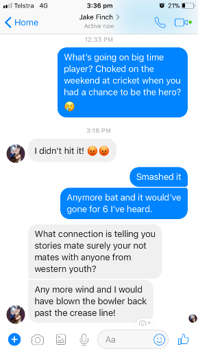 The Dark Knight wrote:And Bedge- Jake Finch was the last wicket, caught behind as I watched from the other end, he was adamant he didn't hit but he hit the cover of it lol.