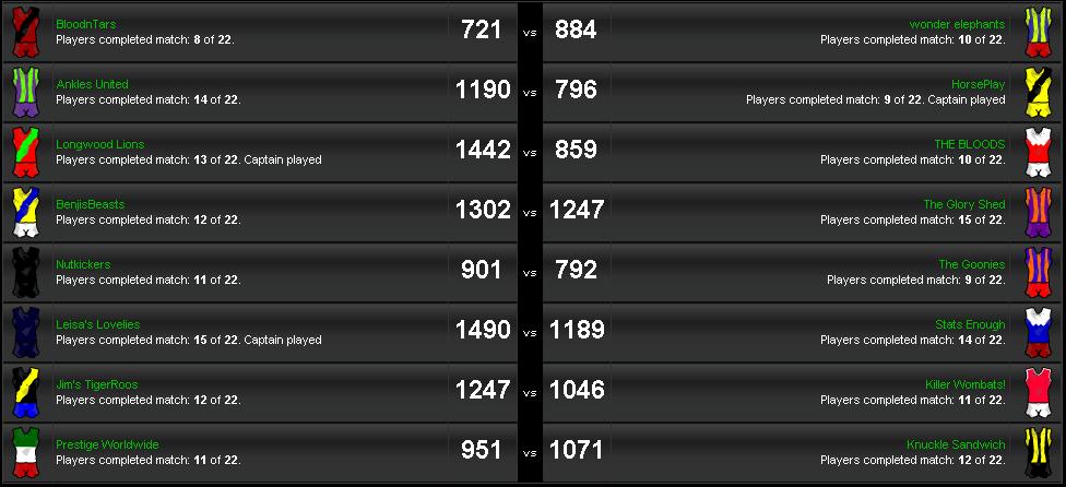 The Goonies look to have been getting plenty of good advice from Dad (or ignoring that same advice) judging by results in recent matches and they might have the goods on Nutkickers in this weeks match. Stats Enough will be tested by Leisa's Lovelies but should salute and Ankles United and BenjisBeasts should record comfortable wins. Jims TigeRoos wil get a much needed win over the Wombats! in another close one and Knuckle Sandwich will put away Prestige.