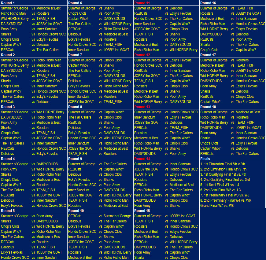 Mediocre aren't in top form just yet so they will be delighted to feature in this round's squeaker as they snuck home by nine points over the HORNEYS. Ecky has shown themselves to be the team to beat so far this season with some very solid early season scoring although the Roosters topped the scoring for the round. It's always good to get off the mark and this week it was Poon, REBCats, Mediocre, and Roosters who achieved the feat one week later than they would have liked. The unlucky team of the week was DAISY who would have won against most other opposition but were bested by a pumped up Roosters.