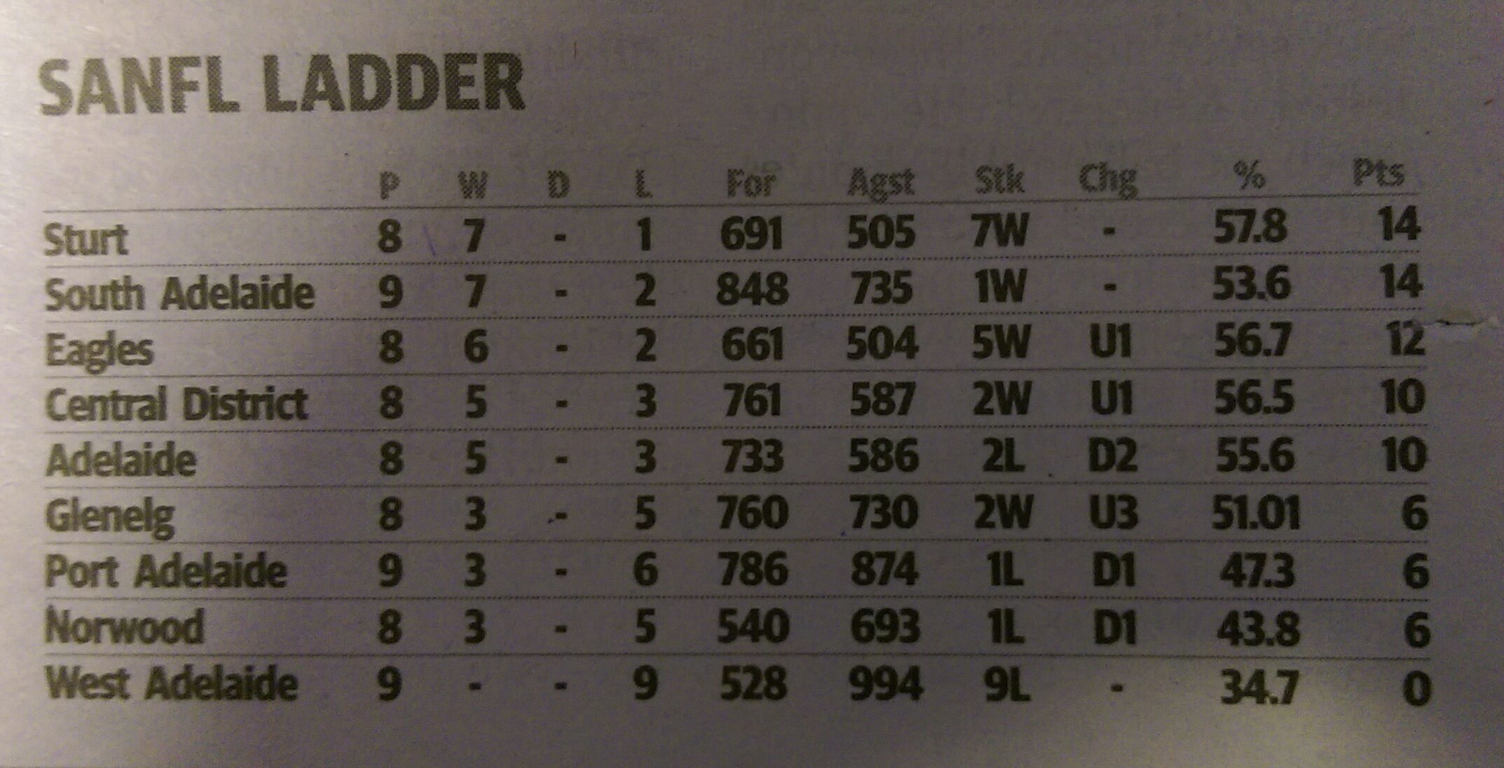 Ian wrote:This weeks SANFL ladder, for those of you who can't understand why North supporters aren't happy with the season, 6 wins from 121 games isn't real flash. BTW, South or the Eagles games don't add up either.