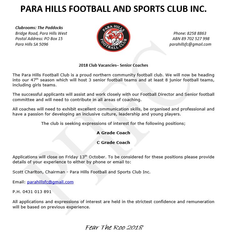 As a consequence of this the Morphett Vale Football Club is seeking applications for its A Grade Coach for 2018 and beyond. Applicants are being sought to lead the club in all levels from U13 to A Grade with a view to establishing high levels of professionalism and achievement throughout the club.