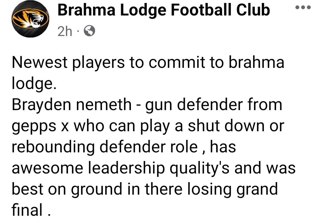 Brahma lodge new signing nemeth. apparently best on ground in gepps cross grand final loss..didnt even play he played 5 c grade games and 1.b grade game.