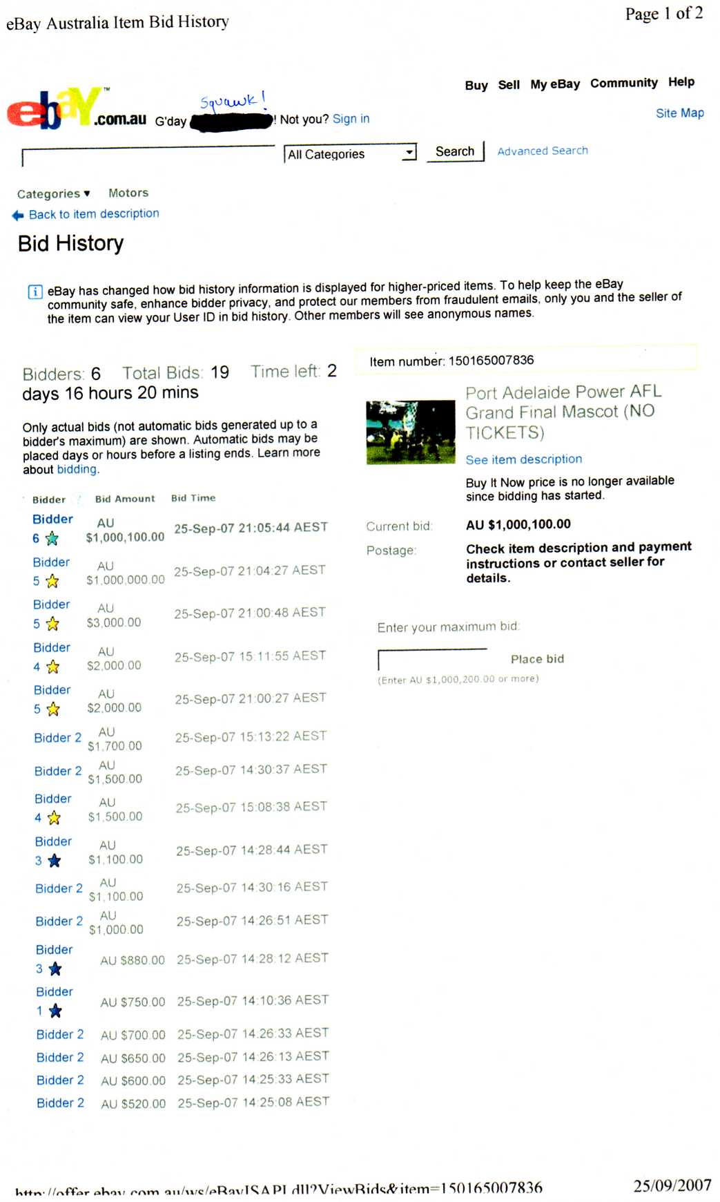 Ebay has a bid of $1,000,100 registered for a child to run out with Port Power on Grand Final Day at the MCG. Previous bid was an even million.